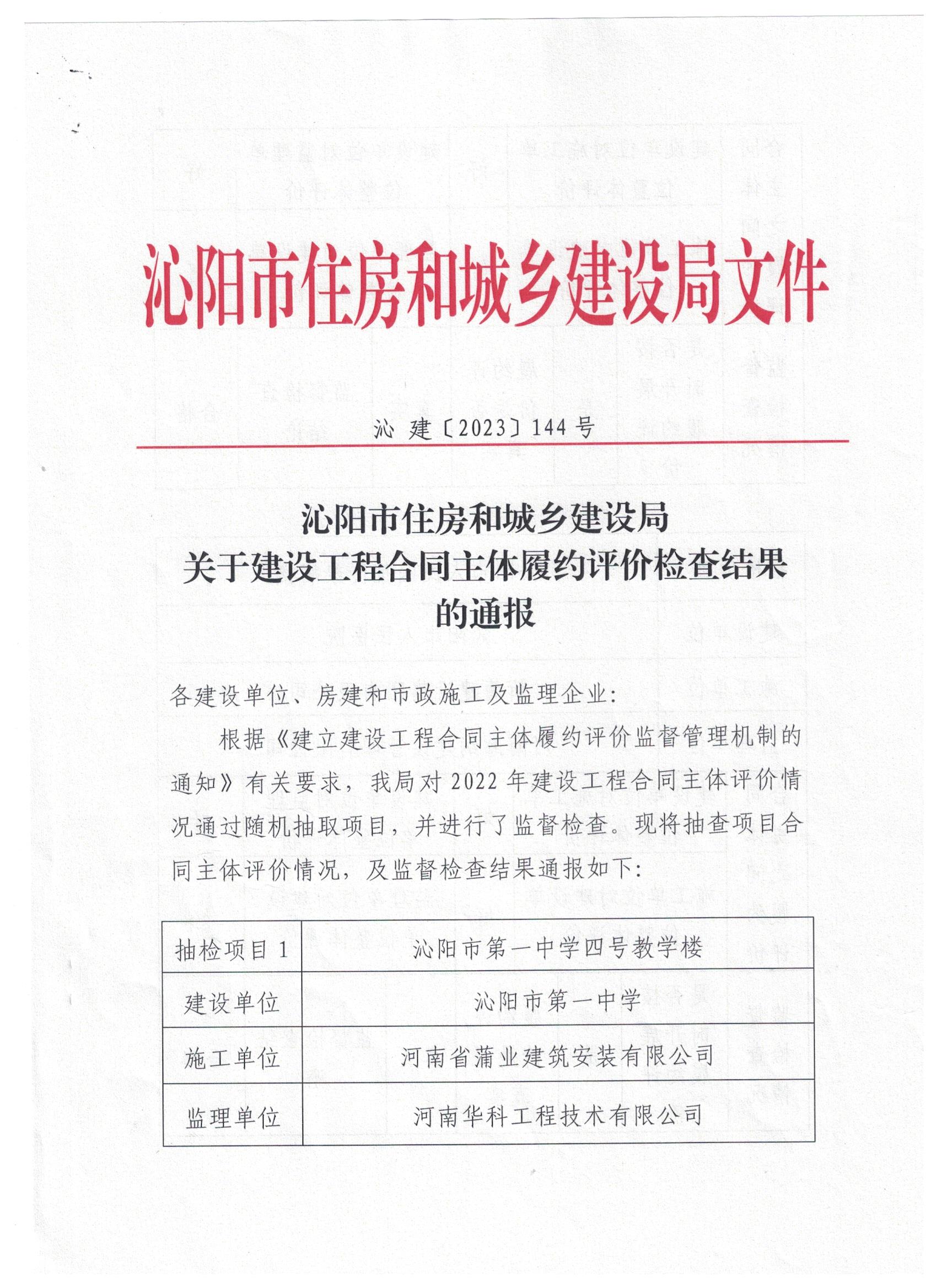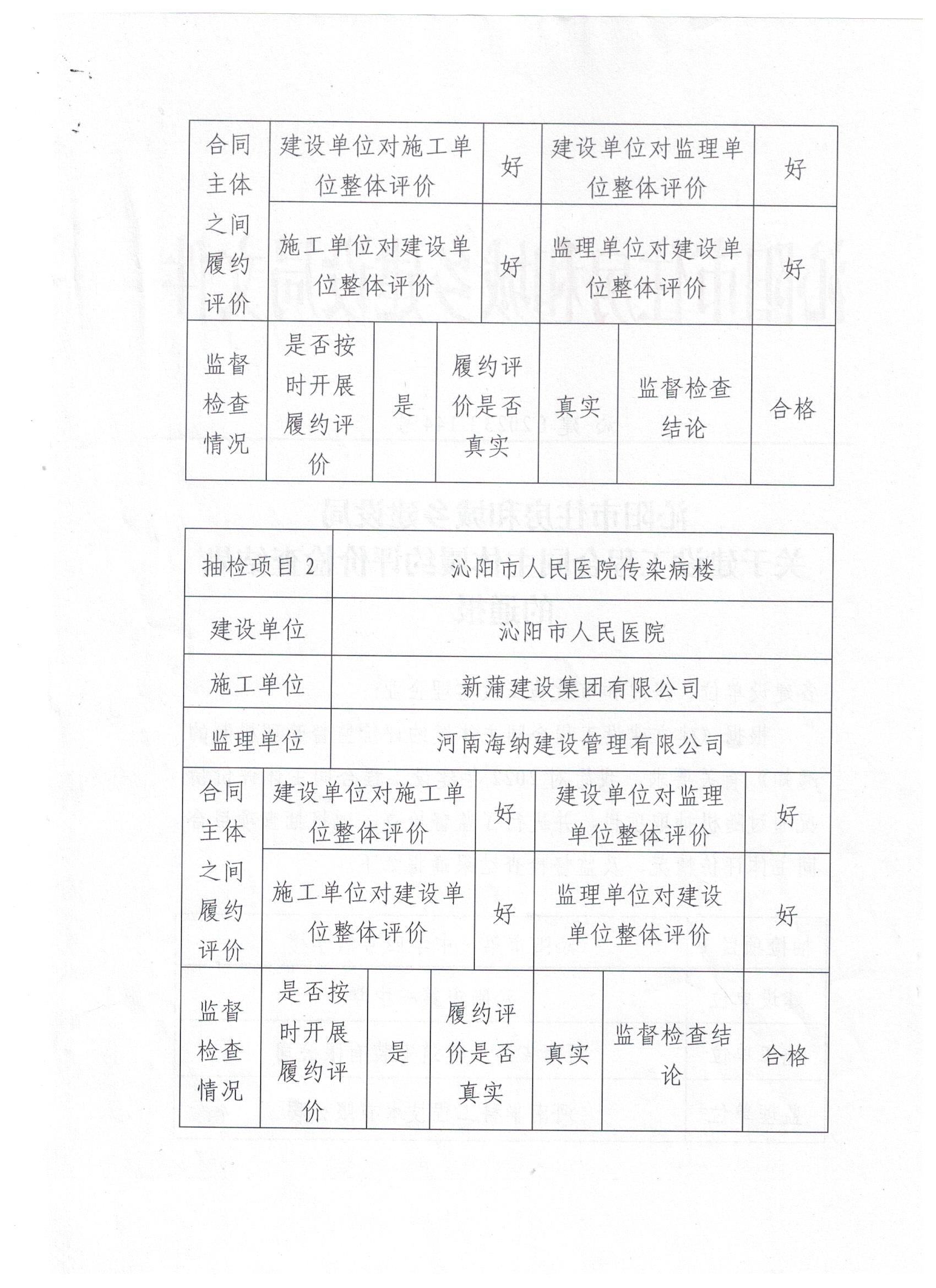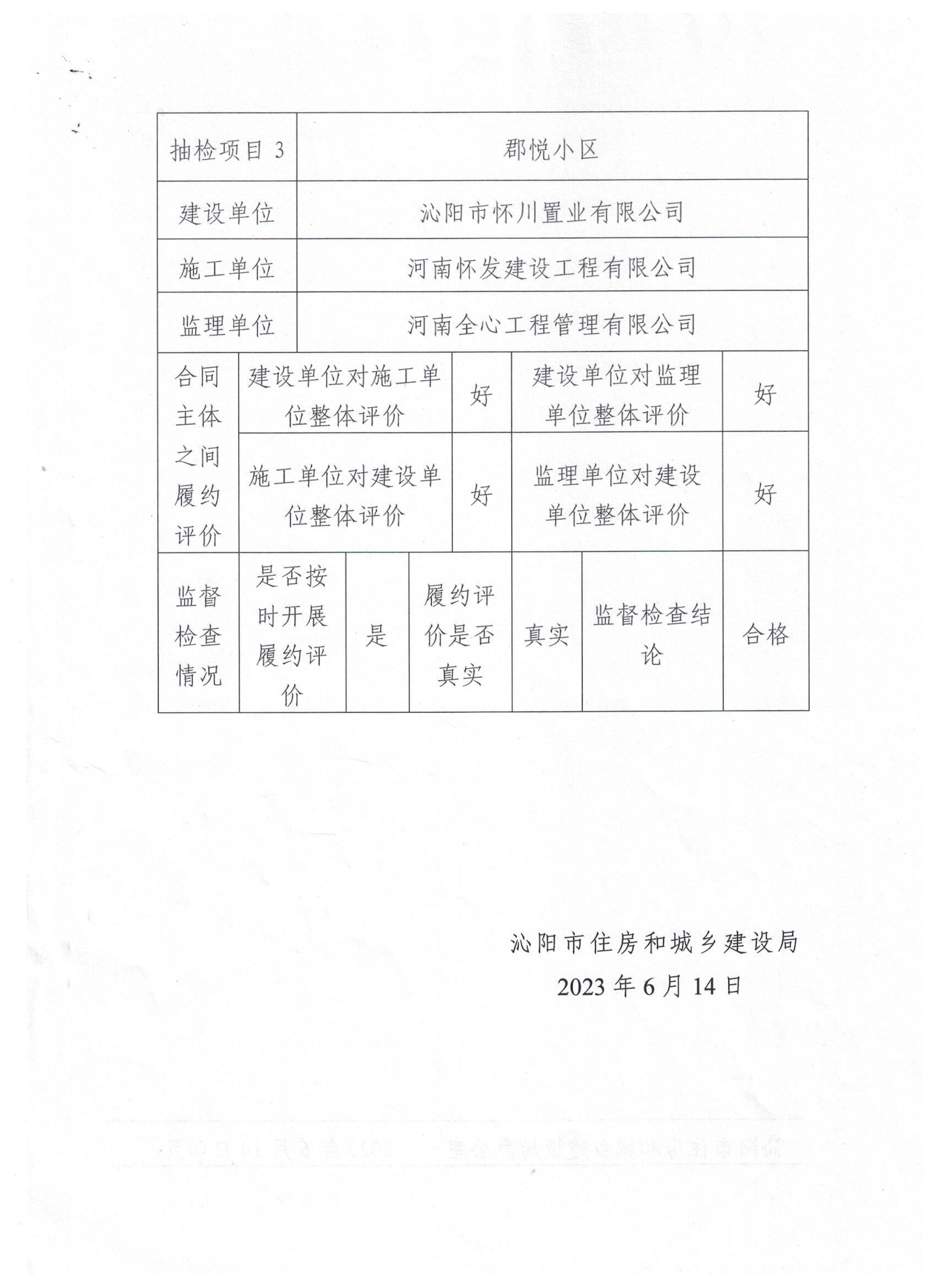 沁阳市住房和城乡建设局关于建设工程合同主体履约评价检查结果的通报
